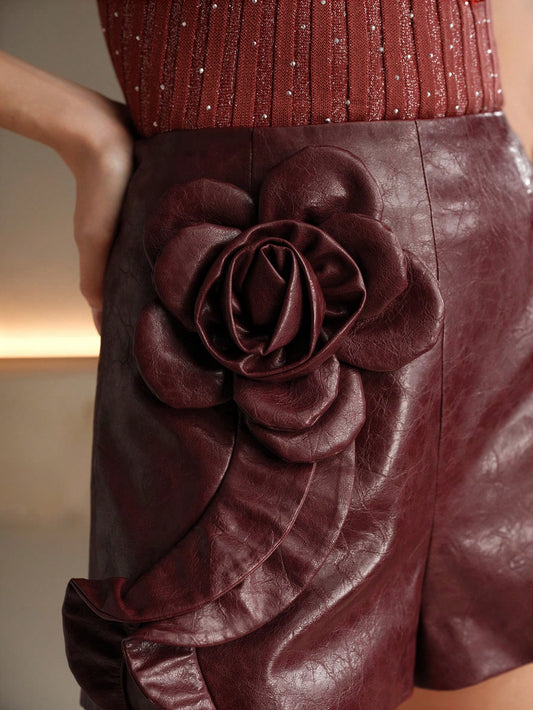 Elegant 3D Floral Applique PU Leather Shorts for Women - Perfect Fall & Winter Outfit