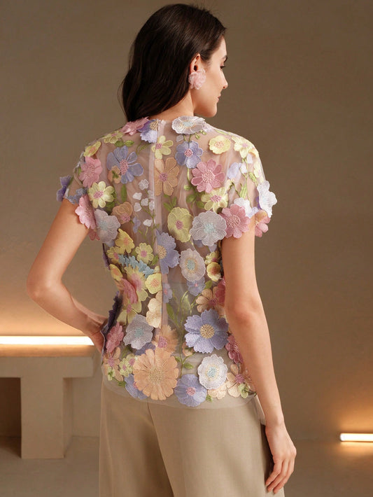 3D Floral Embroidery Multi-Color Blouse for a Romantic Look