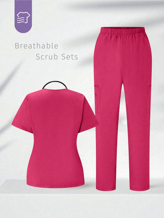 Solid Color Short Sleeve Pocket Top and Pants Scrub Uniform Set for Women