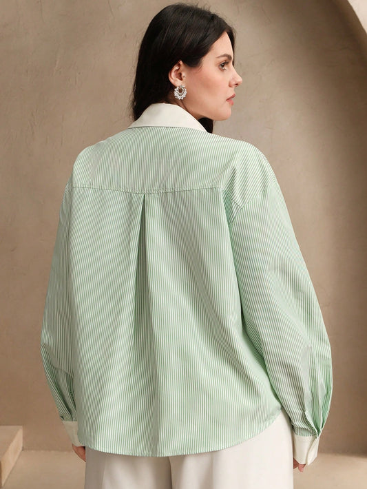 Chic Striped Long Sleeve Blouse with Pearl Rhinestone Eyes - Elegant Casual Top for Spring