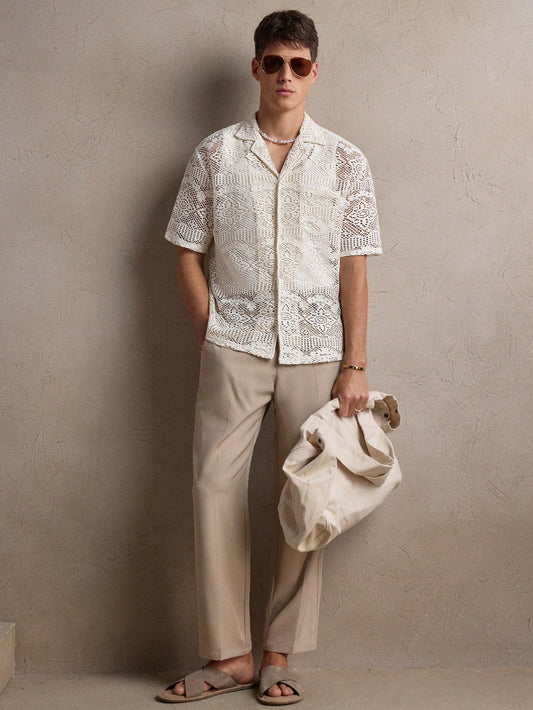 Men's Knit Crocheted Apricot Shirt - Perfect for Summer Weddings, Everyday Casual Wear