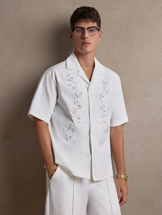 Men's White Floral Loose Shirt with Rhinestone Applique for Casual Spring