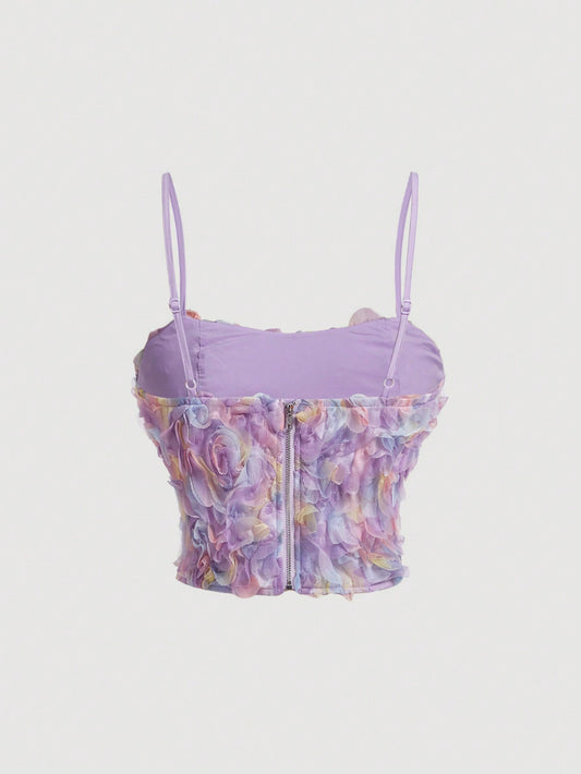 Chic & Stylish: Purple 3D Mesh Floral Print Camisole Top