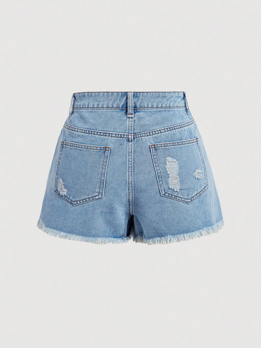 Trendy Distressed Denim Shorts with Pocket Inserts and Bow Details