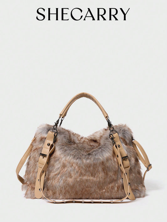 Chic Fluffy Patchwork Tote Bag for Women - Stylish Fur Commuting Purse