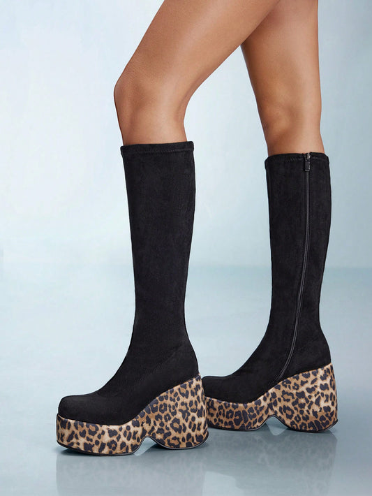 Leopard Print Chunky Heel Boots Comfortable Round Toe Design with Side Zipper