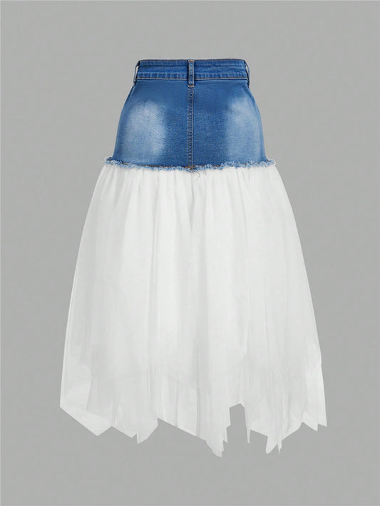 Chic & Versatile: Ladies' A-Line Denim Mesh Contrast Skirt