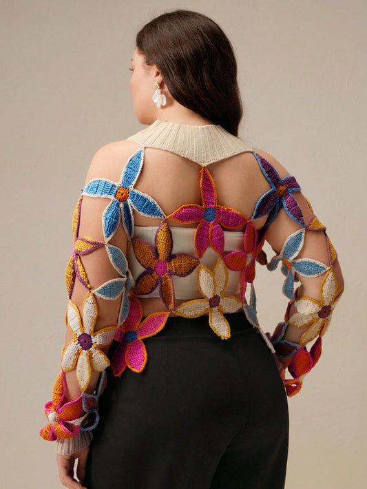 Chic Autumn Elegance: Plus Size Floral Crochet Hollow Out Sweater