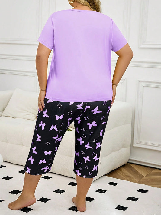 Embrace Comfort: Plus Size Butterfly Print Short Sleeve T-Shirt & 7/8 Pants Pajama