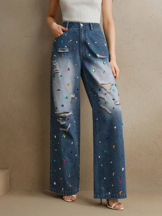 Retro Chic: Distressed Rhinestone-Embellished Blue Jeans for Fashion-Forward Women