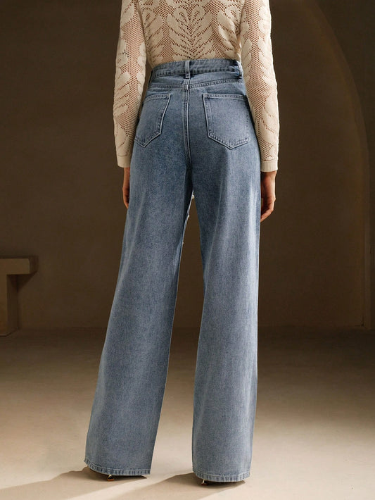 Chic & Stylish Women's High-Waist Pearl Embellished Wide Leg Jeans