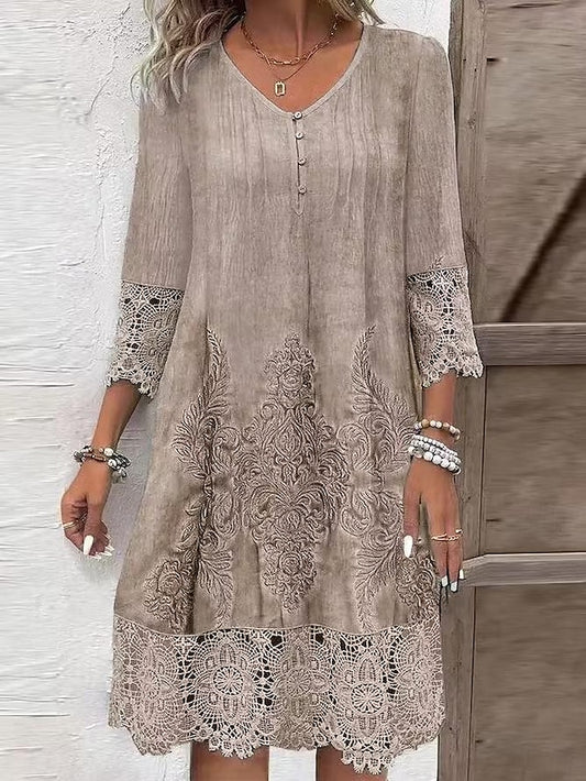 Boho Chic V-Neck Lace Detail Dress - Relaxed Fit Beige Linen Blend for Spring & Autumn