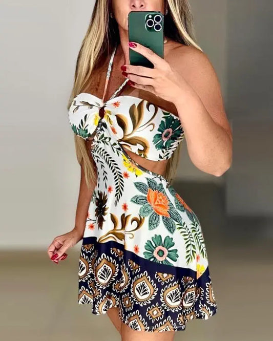 Bohemian Chic: Tribal Print Halter Mini Dress with Hollow-Out Detail
