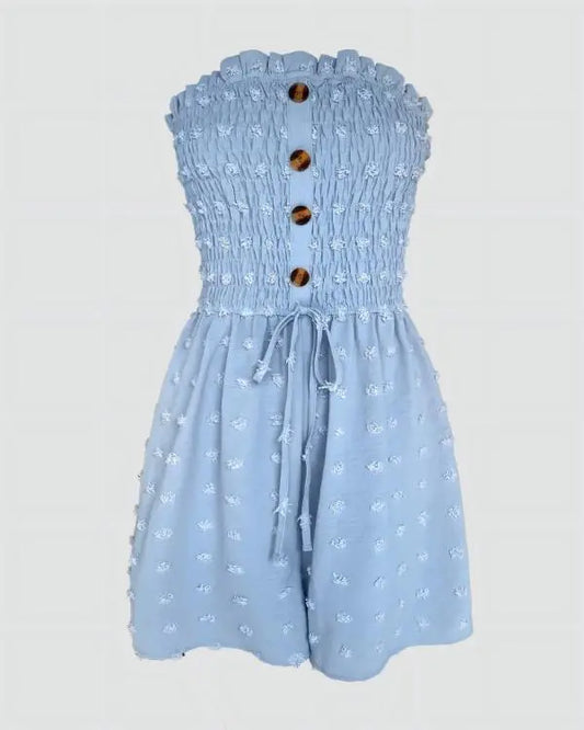 Chic Polka Dot Bandeau Sleeveless Shirred Romper with Button Detail & Tied Accent