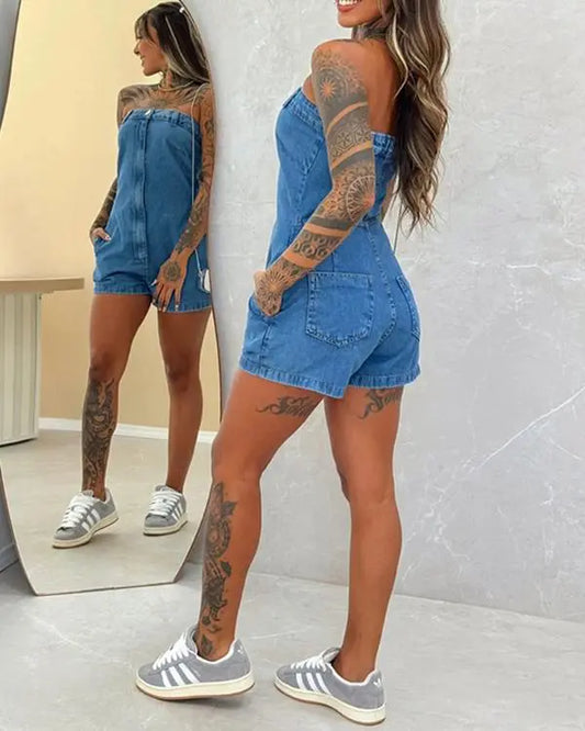 Chic Bandeau Sleeveless Button-Design Jean Romper - Effortless Casual Slim-Fit Style