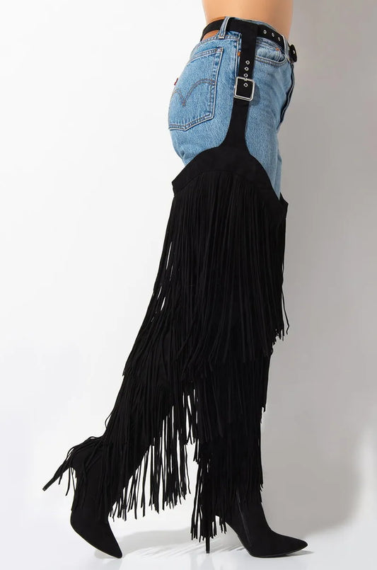 Fringe Belted Chaps Over The Knee Snakeskin Boots Women Pointed Toe Thigh High Long Tassel Boots