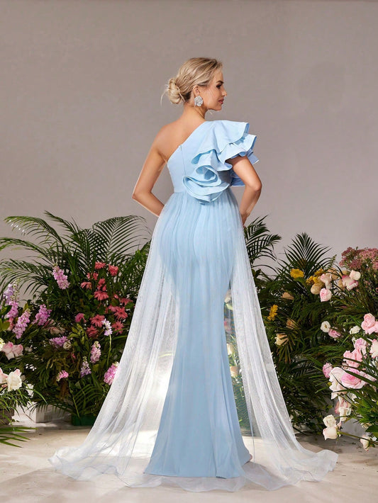 Elegantly Chic Maternity Mermaid Dress with Asymmetrical Neckline and Ruffle Trim