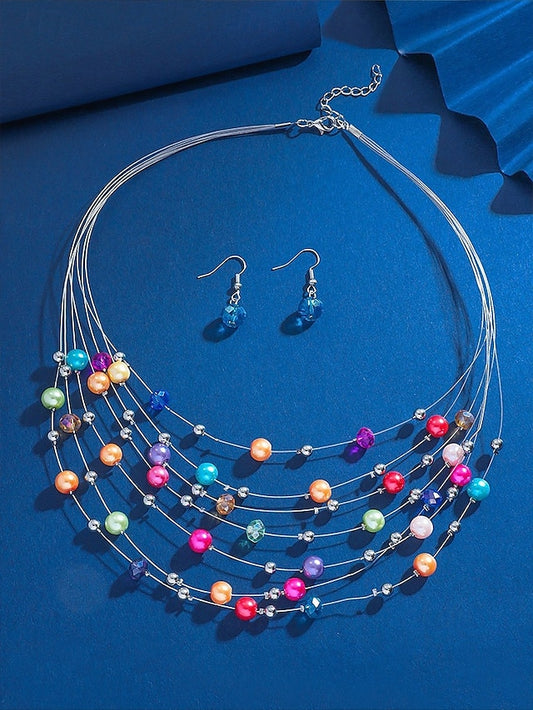 Elegant Colorful Imitation Pearl Jewelry Set: Hoop Earrings and Necklace