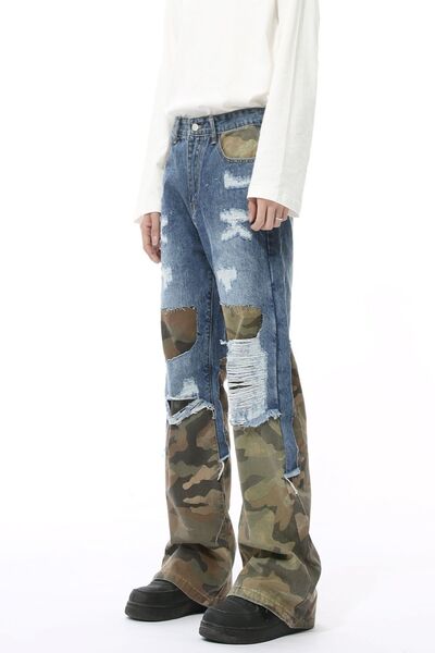 Distressed Camouflage Patchwork Jeans