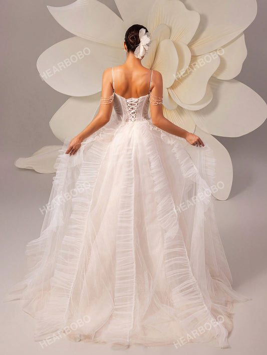 Graceful Spaghetti Strap Sexy Deep V-Neck A-Line Wedding Gown For Bride