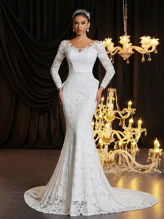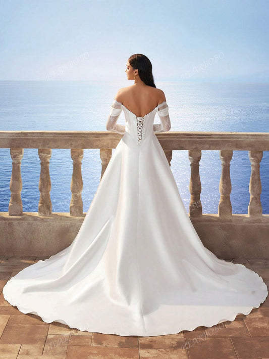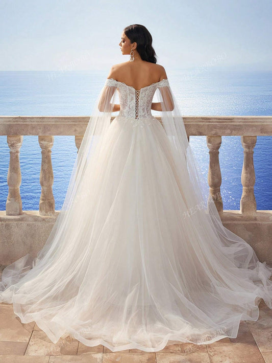 Elegant Vintage Off-Shoulder Mesh Lace Wedding Dress with Tail