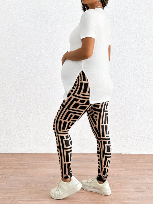 Cozy & Cute: SHEIN Maternity Bear Print Long Sleeve Top & Geometric Leggings Set