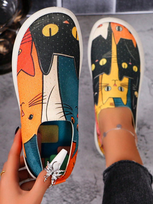 Charming Kitten Pattern Knit Slip-On Sneakers - Perfect for Casual Travel!
