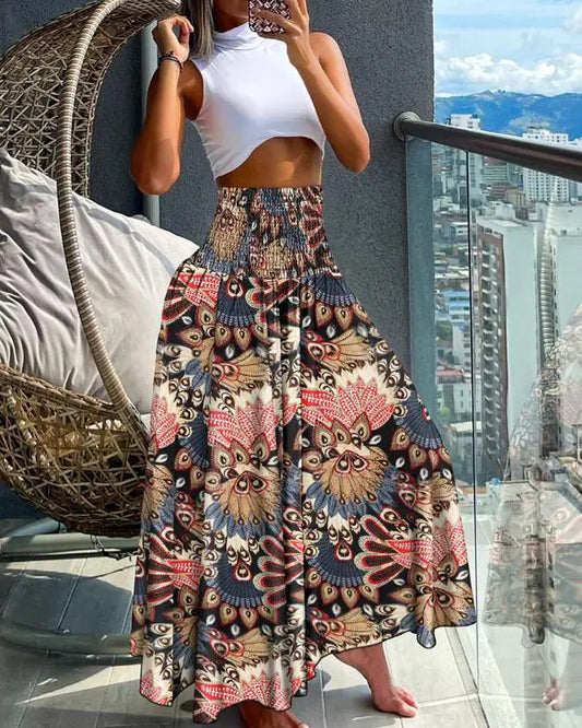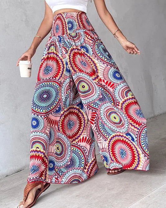 Chic Geometric Tribal Print Shirred Wide Leg Pants for Effortless Style