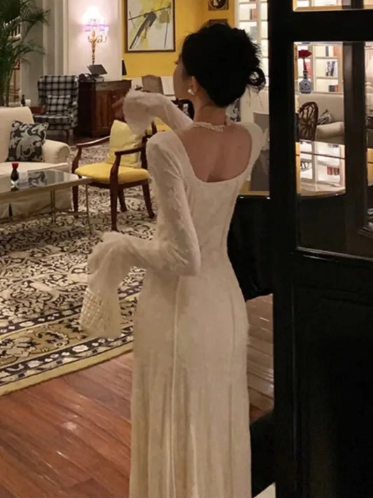 Chic Vintage A-Line Lace Dress: Elegant Long Sleeve Party Wear for Women