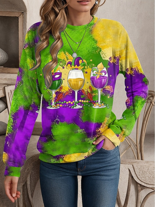 Vibrant Mardi Gras Graphic Long Sleeve V-Neck T-Shirt for Women