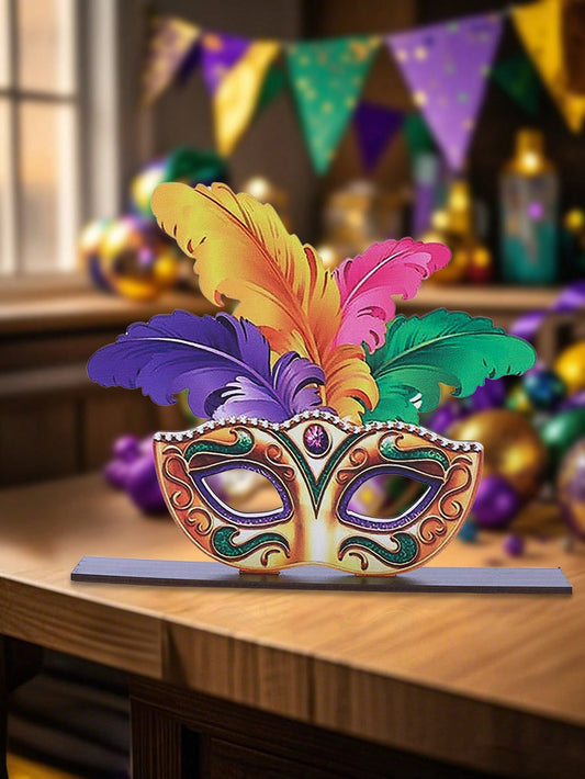 Festive Feather Mask Wooden Desk Ornament - Perfect for Mardi Gras