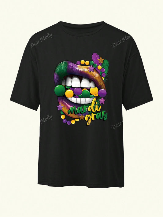 Vibrant Mardi Gras Cartoon Graphic Tee – Casual Crew Neck for Spring/Summer