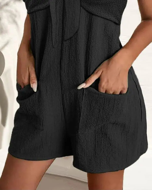 Chic Green V-Neck Front Tie Romper with Chain Straps and Pockets