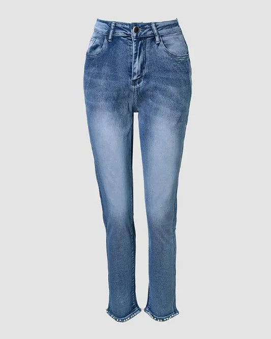 Sparkling Elegance: Rhinestone Beaded Butterfly Split Hem Jeans