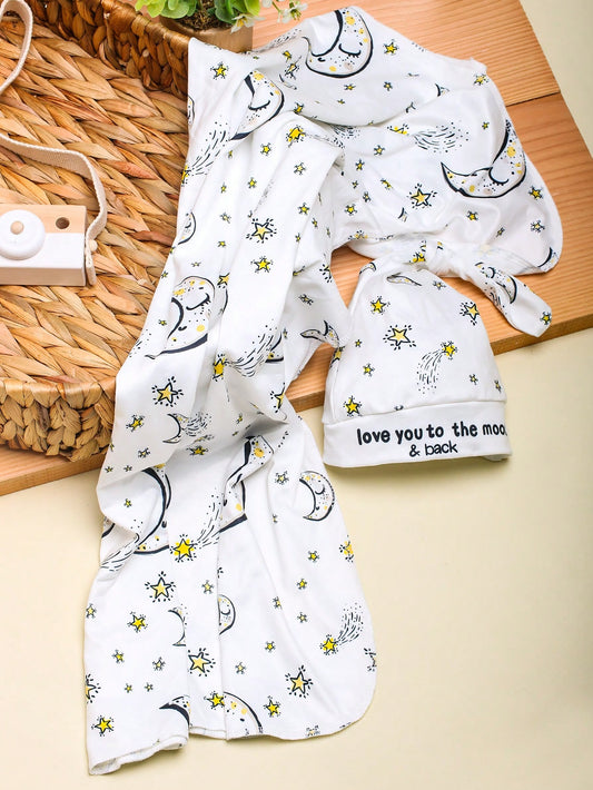 Adorable Newborn Baby Boy Star & Moon Print Blanket and Hat Photo Set