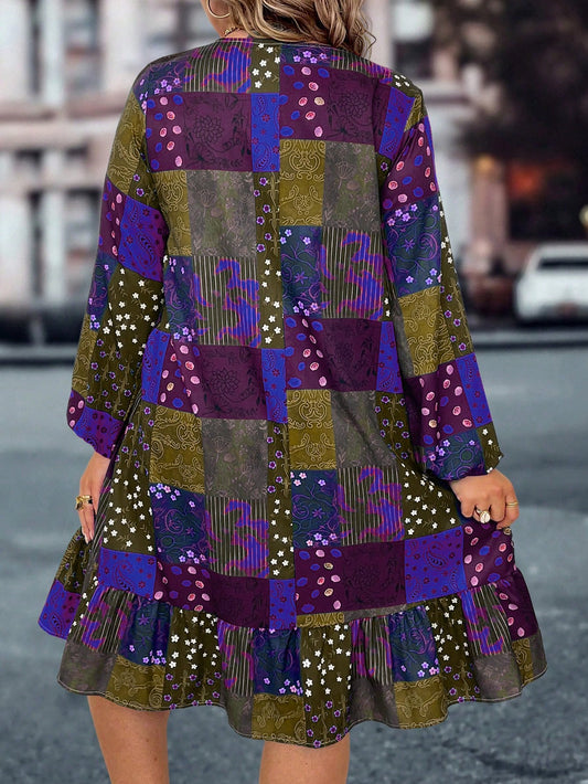 Plus Size Color Block Round Neck Long Sleeve Summer Dress – Stylish
