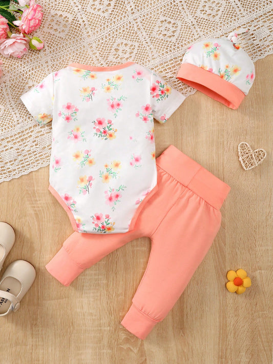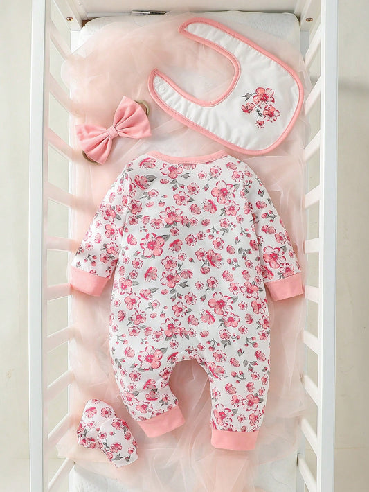 Charming Floral Print Ruffle Trim Jumpsuit Set for Baby Girls - Includes Headband, Bib, and Gloves