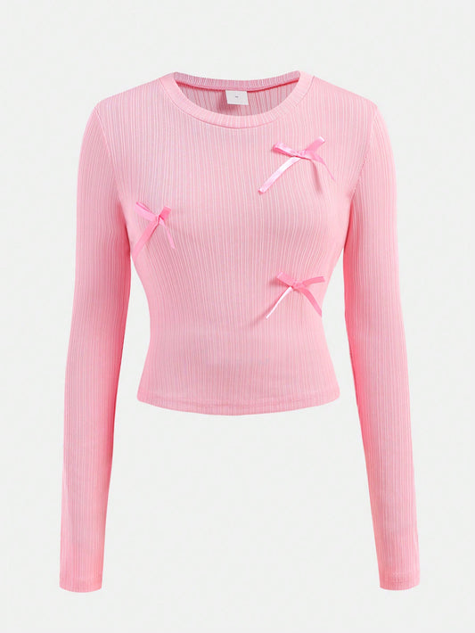 Chic Pink Satin Bow Long Sleeve Top – Perfect for Back-to-School & Valentine's Day!