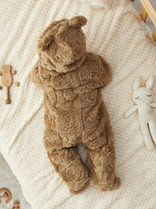 Cuddly Cartoon Print Fleece Hooded Romper for Newborns - Perfect for Autumn & Winter Adventures!