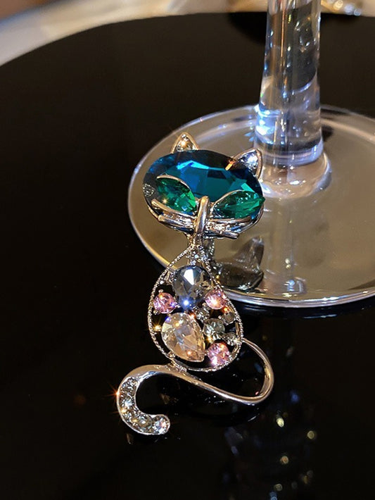 Chic Korean Rhinestone Cat Pendant Brooch – Elegant Gold Alloy Animal Pin for Everyday Style