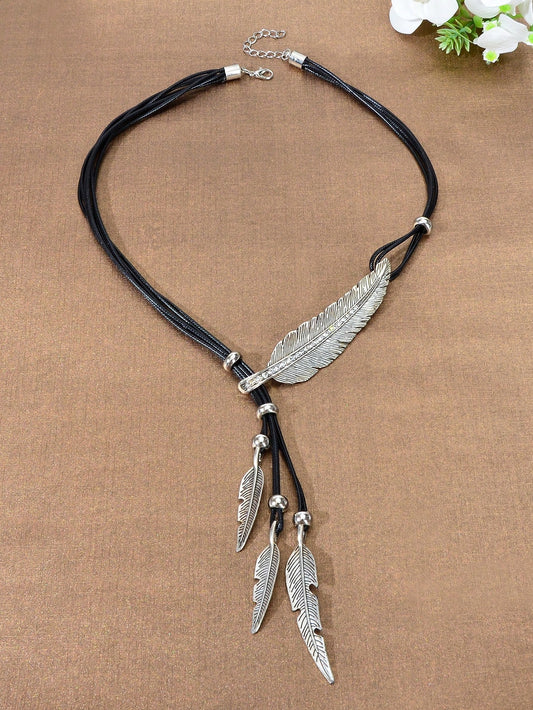 Bohemian Chic: Handmade Black PU Rope Necklace with Antique Silver Feather Pendant