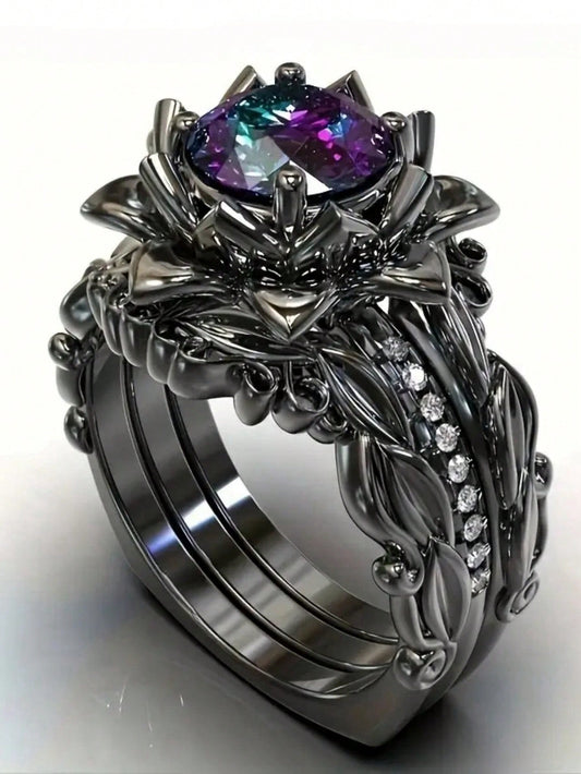 Opulent Elegance: 3-Piece Black Leaf & Flower Ring Set with Rainbow Cubic Zirconia