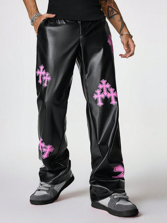 Men's Loose Straight Brazil Leather Long Pants, Graphic Going Out Baggy