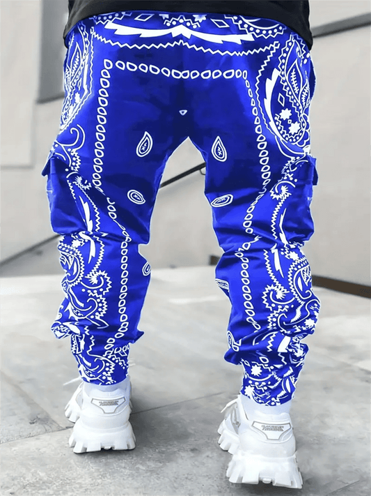 Men's Cashew Flower Multi-Pocket Workwear Pants - Stylish Casual Glow Printed Running Trousers