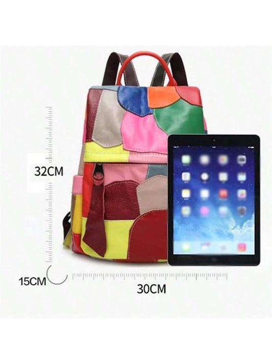 Chic Genuine Leather Leisure Backpack - Spacious Cowhide Travel Bag with Stylish Patchwork