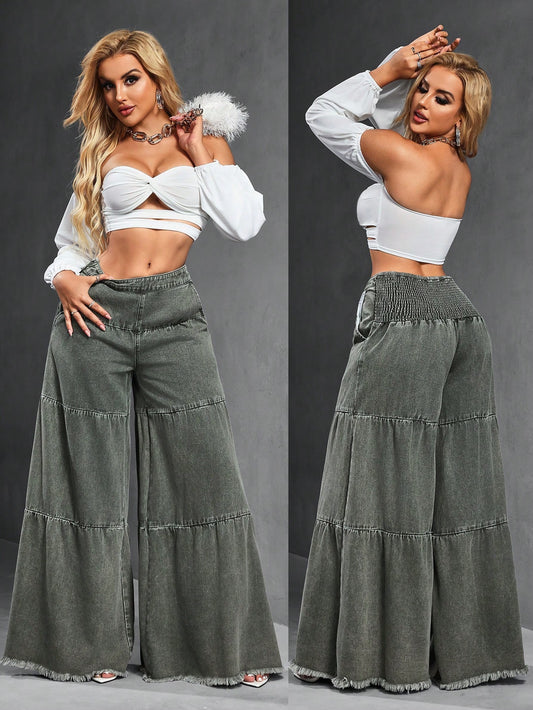 Chic Vacation Casual Ruffled Hem Wide Leg Jeans for Effortless Style