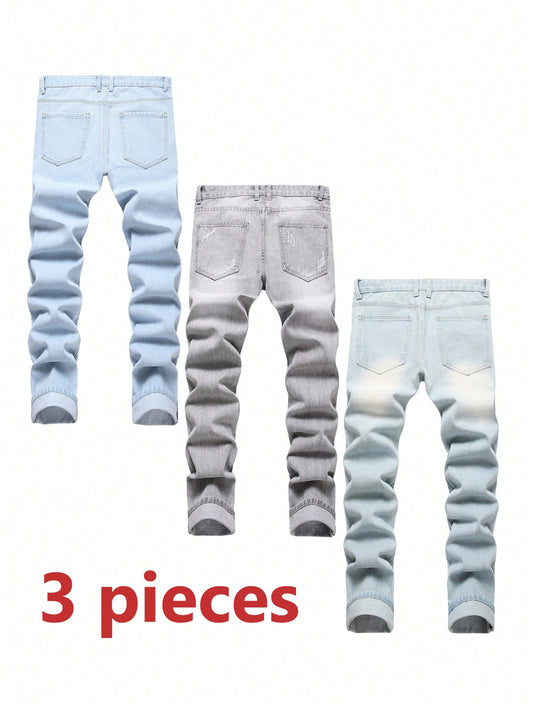 Stylish 3-Piece Ripped Jeans for Men - Slim Fit Distressed Denim with Embroidered Patterns, Perfect for Casual Wear and Christmas Gifts