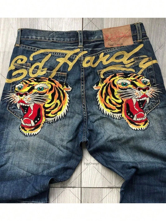 Retro Gothic Tiger Graphic Denim Jeans for Men - Y2K Punk Streetwear Style
