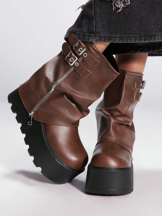 Shop Sugerpunk 2025: Stylish Mid-Calf Thick Sole Leather Boots with Buckle Strap for Autumn-Winter Fashion