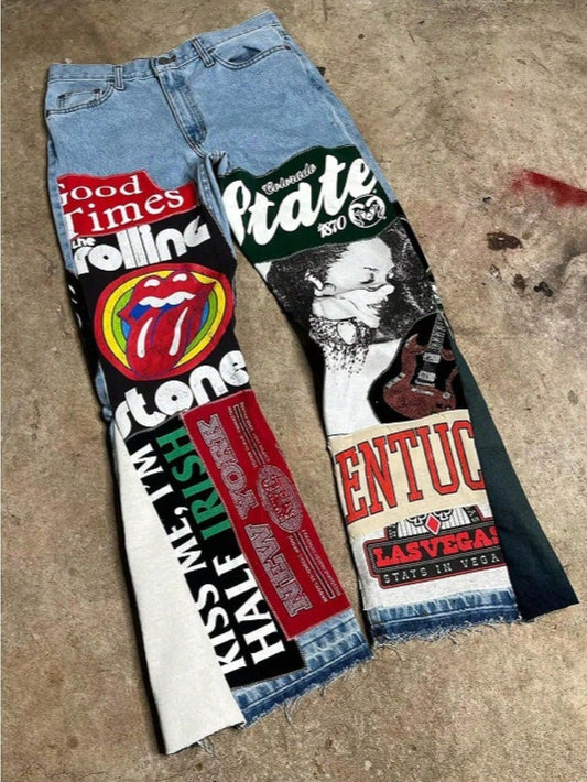 Retro-Inspired Men's Vintage Patchwork Graphic Jeans - Distressed Wide Leg Streetwear with USA Pop Culture Prints